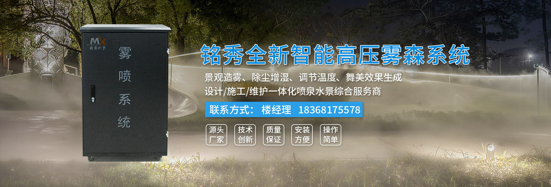 杭州銘秀水藝水景設(shè)備有限公司位于杭州余杭鳳都工業(yè)園區(qū)內(nèi),是一家專業(yè)從事噴霧(霧森)設(shè)備、冷霧設(shè)備、噴泉設(shè)備集各種新型水景設(shè)備生產(chǎn)、銷售與租賃的企業(yè)。 公司技術(shù)力量雄厚,機(jī)械加工設(shè)備齊全,并擁有一支經(jīng)驗(yàn)豐富的設(shè)備研發(fā)隊(duì)伍和一套完善的售后服務(wù)系統(tǒng)。